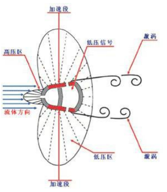 如圖, 低壓取壓孔在傳感器側(cè)后兩邊、 傳感器與流體分離點(diǎn)之前, 既避免了低壓孔受渦流影響, 又避免了低壓孔被堵, 完全實(shí)現(xiàn)了本身的抗堵,使低壓信號(hào)更穩(wěn)定、 精確。