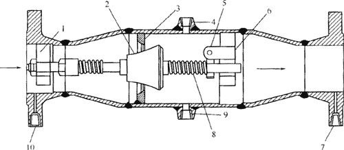-穩定裝置;2-紡錘形活塞;3-固定孔板;4-排氣孔;5-標定和鎖定蝸桿裝置;6-走紙軸支撐;7-低壓側差壓檢出接頭;8-高張力精密彈簧;9-排水孔;10-高壓側差壓檢出接頭